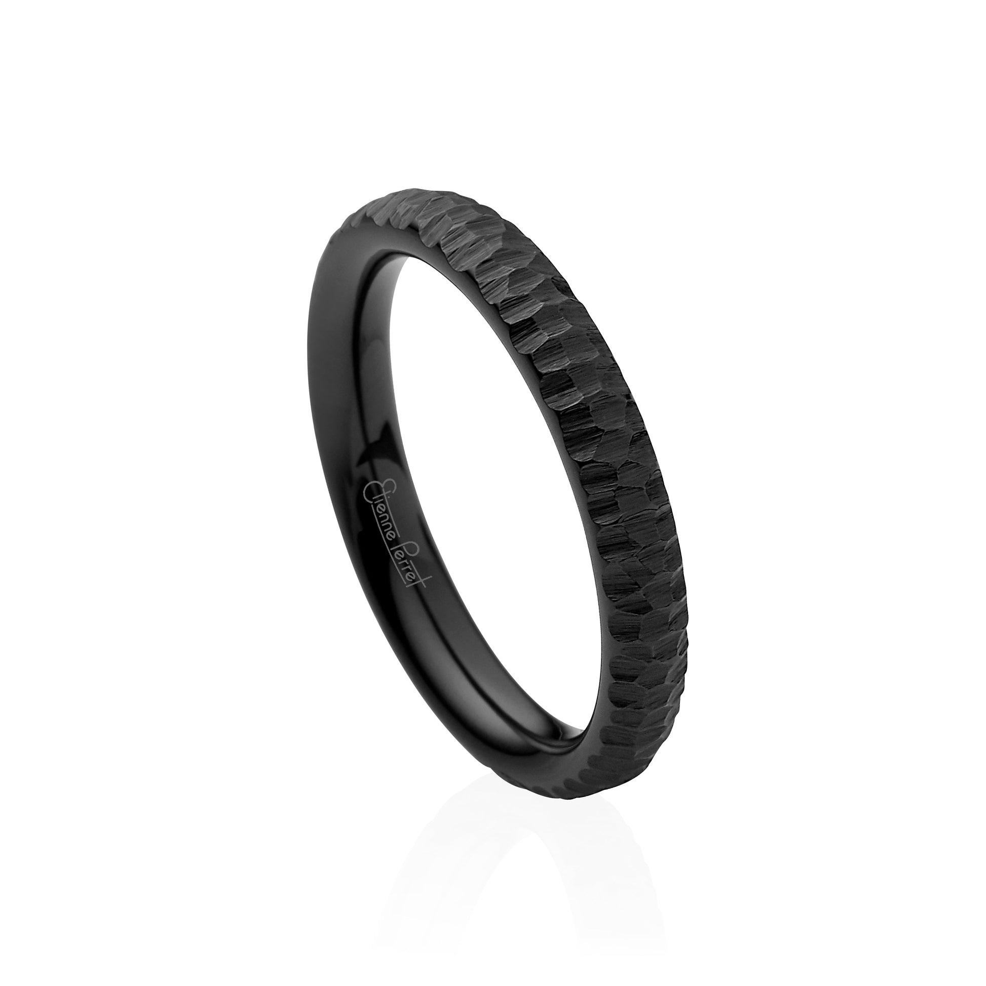 Three-Millimeter Wide Black Gem Ceramic Band with comfort fit inside. Étienne uses the precise dimensions of ceramic machining to show elegant concentricity with his Ceramic Collection. Timeless Black color and Bark finish.