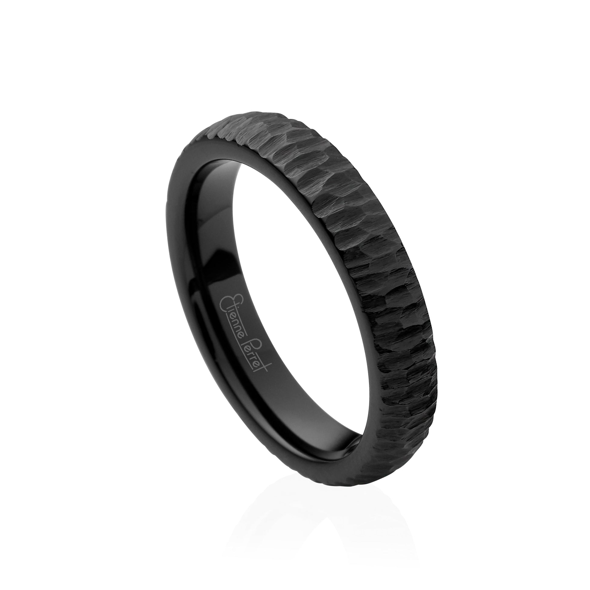 Four-Millimeter Wide Black Gem Ceramic Band with comfort fit inside. Étienne uses the precise dimensions of ceramic machining to show elegant concentricity with his Ceramic Collection. Timeless Black color and Bark finish.