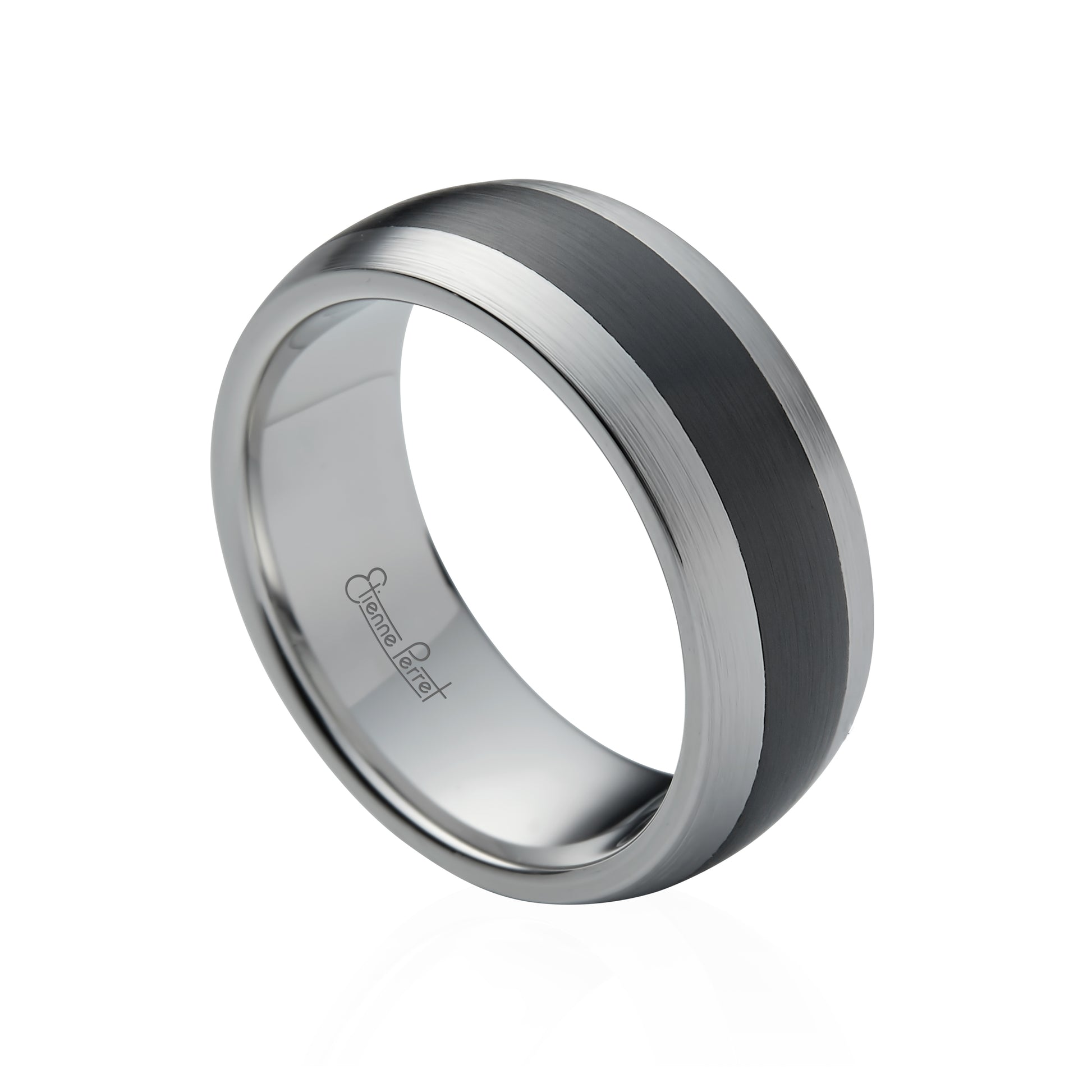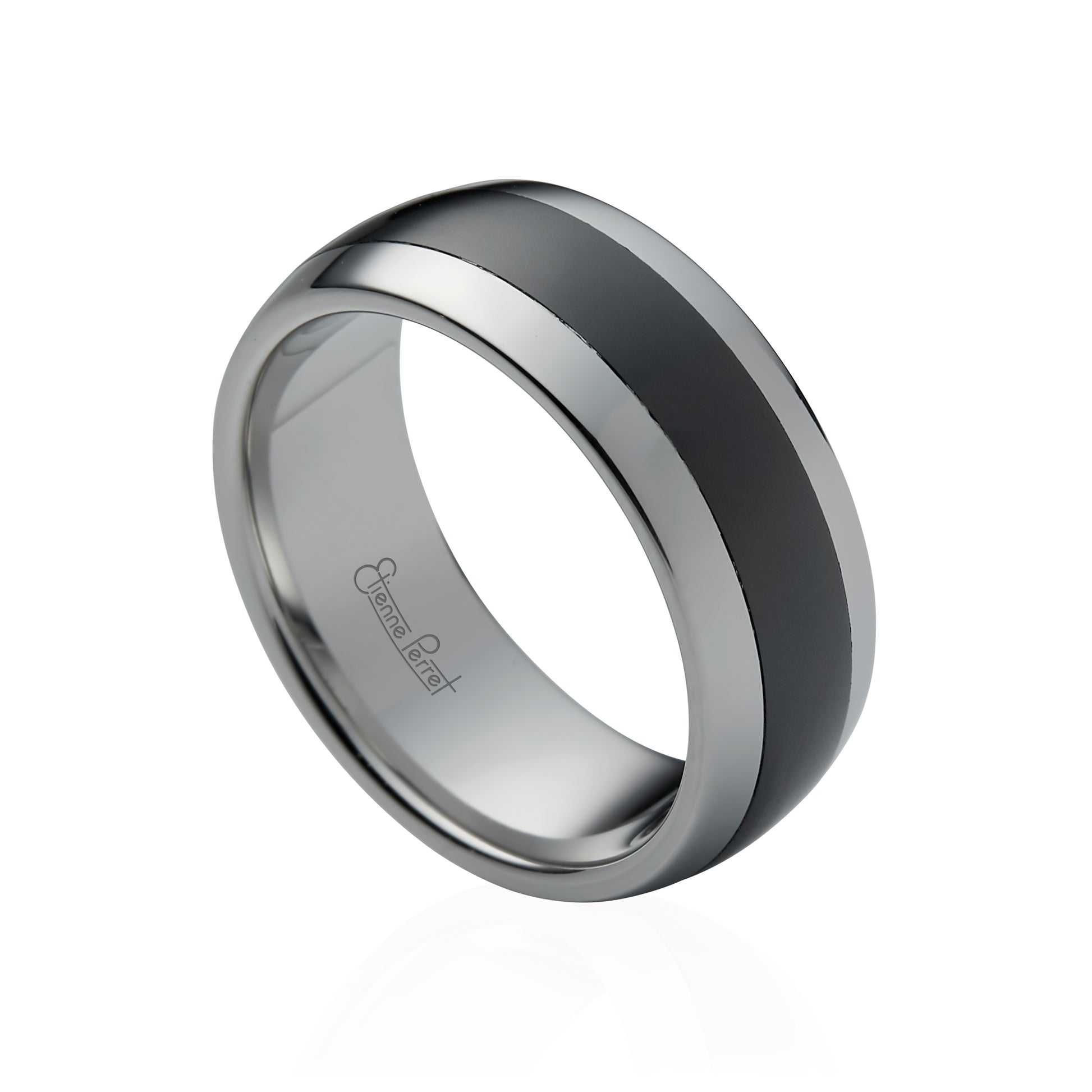 Etienne Perret's Black Gem Ceramic and Satin Cobalt Chrome Overlay Band is a 8mm wide ring. It features a black ceramic center with a cobalt chrome overlay available in polished, matte, or satin finish. Etienne Perret is a jewelry brand known for their unique designs and high-quality materials based out of Coastal, Camden Maine. The combination of black ceramic and satin cobalt chrome creates a modern and sleek look.