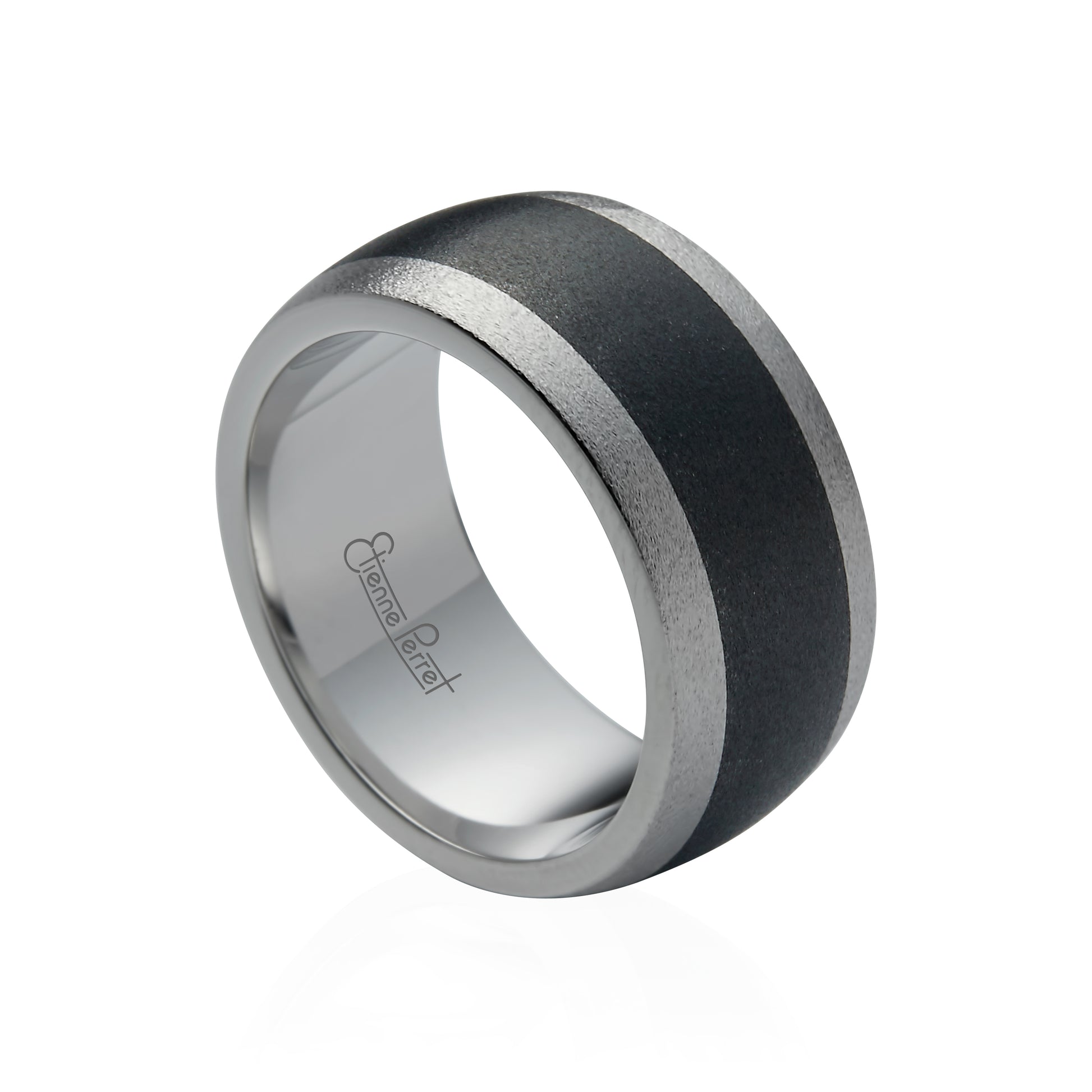 The Cobalt Chrome with Polished Black Gem Ceramic Inlay Band is a 10mm wide ring designed by jewelry designer Etienne Perret. The ring features a cobalt chrome band with a polished black gem ceramic inlay. The black gem ceramic used in this ring is a high-tech material, often used in various high-tech fields such as aerospace, automotive, and medical industries due to its high strength, hardness, and durability. The polished finish of the ceramic adds a shine to the ring, making it stand out. The cobalt chrome band gives the ring a sleek and modern look. Etienne Perret is known for their unique designs and high-quality materials, making this ring a one-of-a-kind piece.