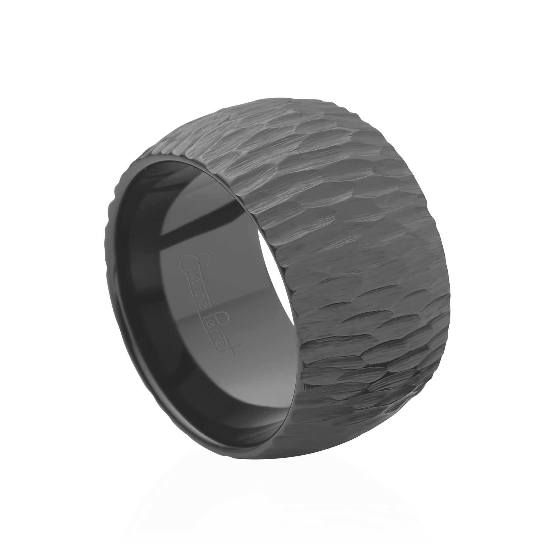 Twelve-Millimeter Wide Grey Gem Ceramic Band with comfort fit inside. Étienne uses the precise dimensions of ceramic machining to show elegant concentricity with his Ceramic Collection. Timeless Grey color and Bark finish.