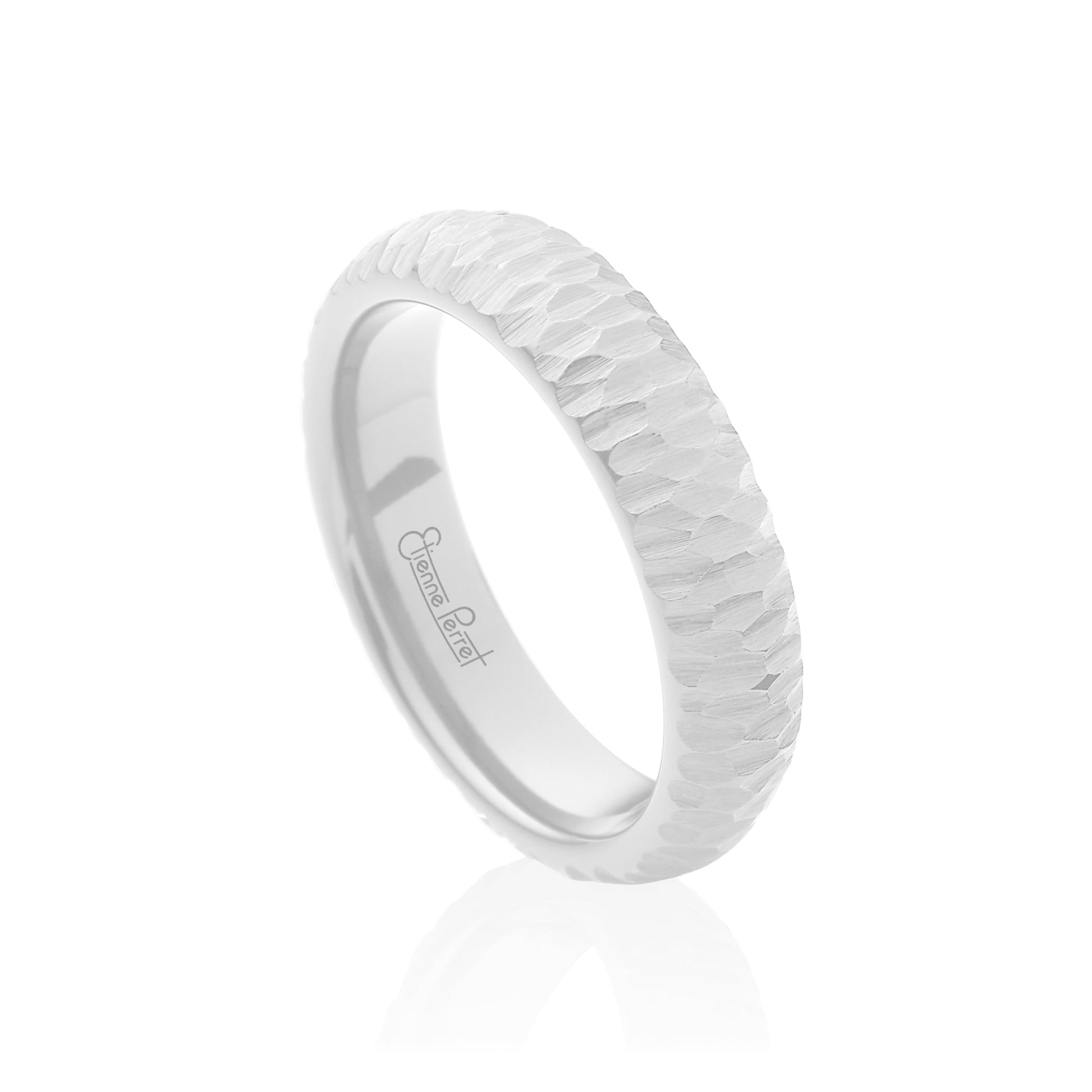 Five-Millimeter Wide White Gem Ceramic Band with comfort fit inside. Étienne uses the precise dimensions of ceramic machining to show elegant concentricity with his Ceramic Collection. Timeless White color and Bark finish.